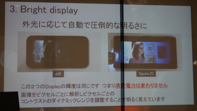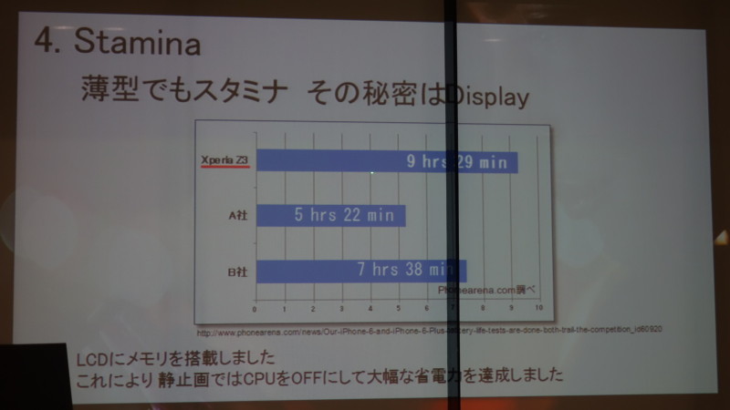 下記スライドの数値は私が先日掲載した記事のものと同じですね。つまりA社とはiPhone6の事であり、B社とはGALAXY S5の事だと分かります。この調査結果に基づくならZ3はZ1の2倍以上持つ事になっていますので本当に期待大です。